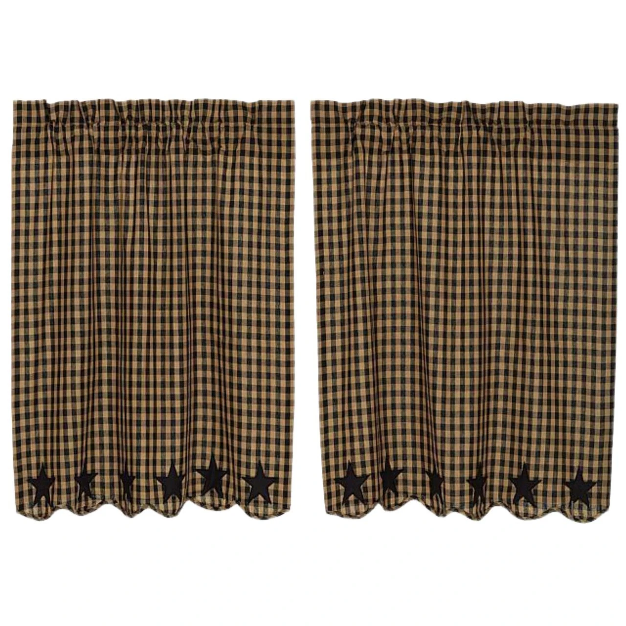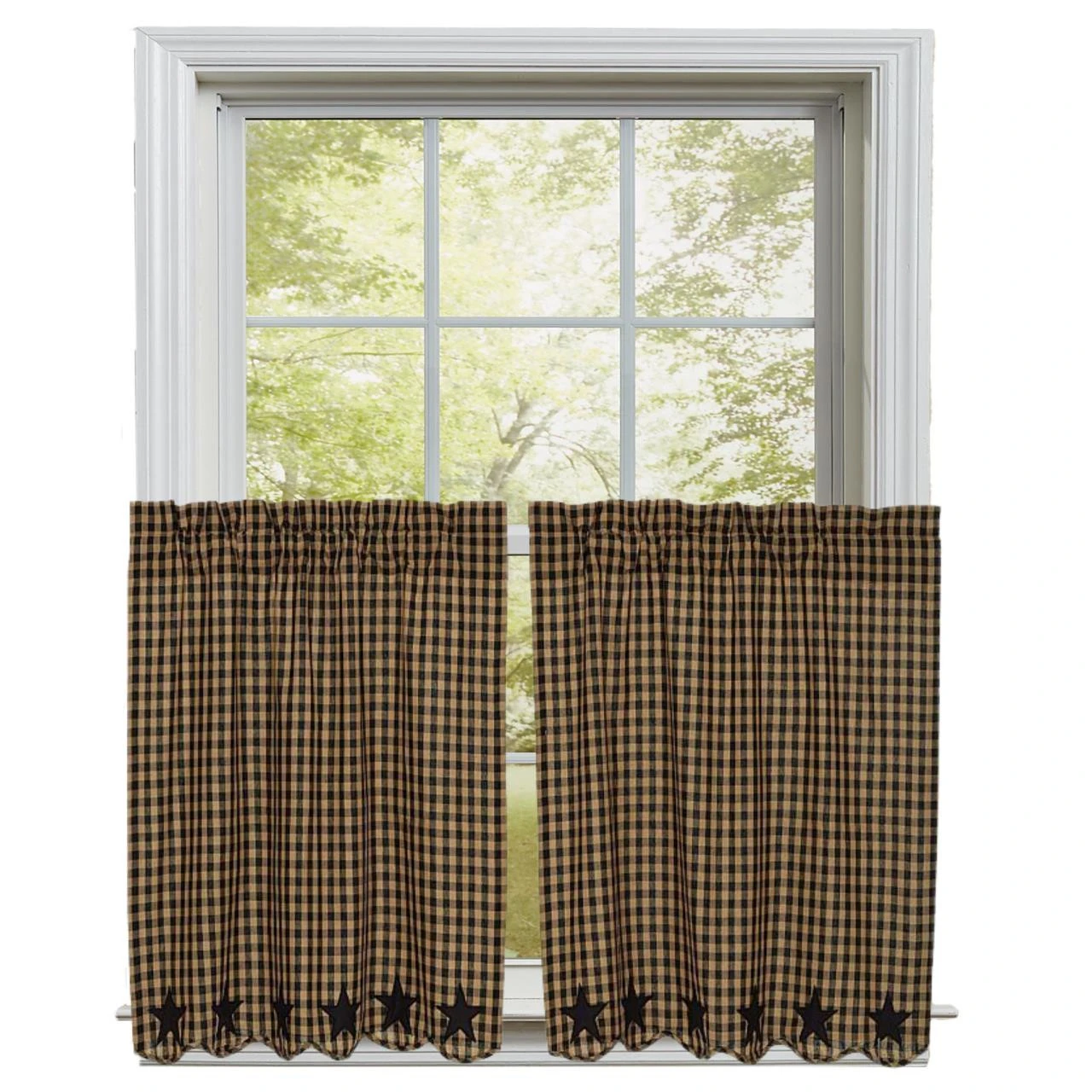 The Black Star Tiers feature a vintage color palette of black & khaki tan with appliqued black stars dancing along the scalloped hems. Make a striking statement in your home decor when you dress your windows in these charming tiers! Charming on their own, or pair with a coordinating valance for a more dramatic appeal!