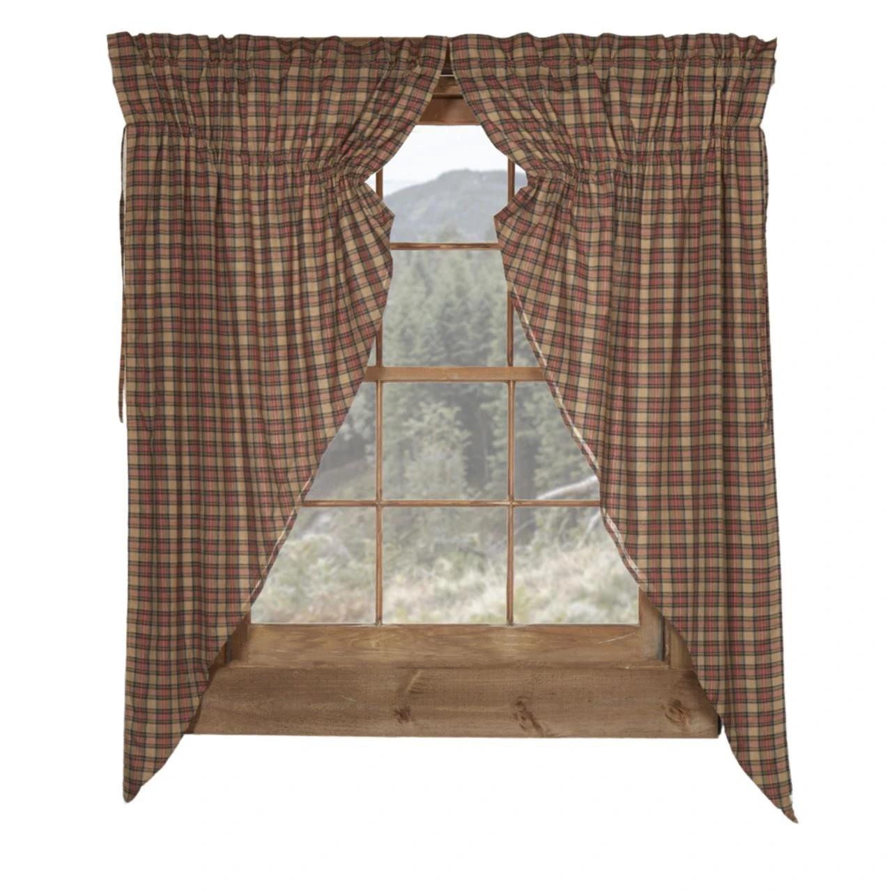 The Crosswoods Prairie Gathered Curtains are a blend of barn red, black, country blue and farmhouse tan to make a pleasing plaid to complement the bedding collection.