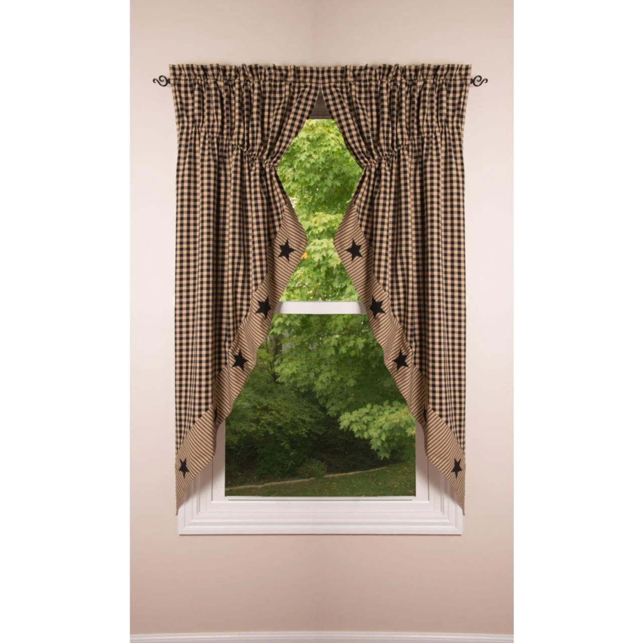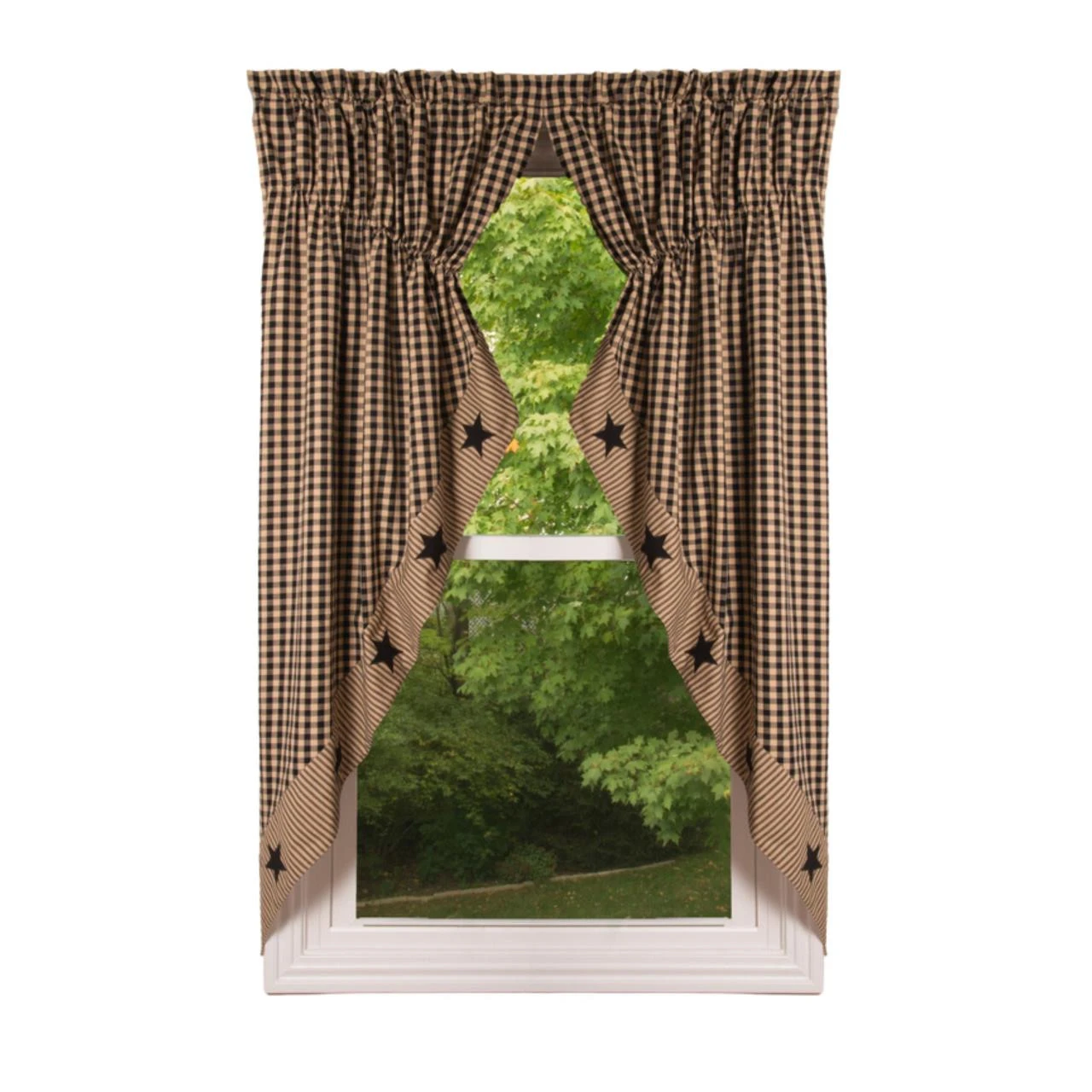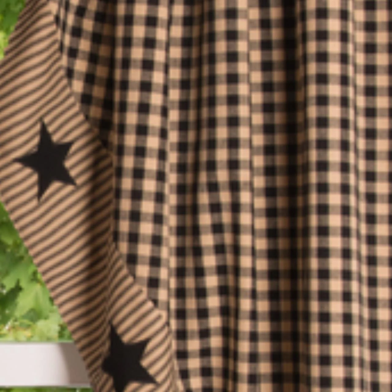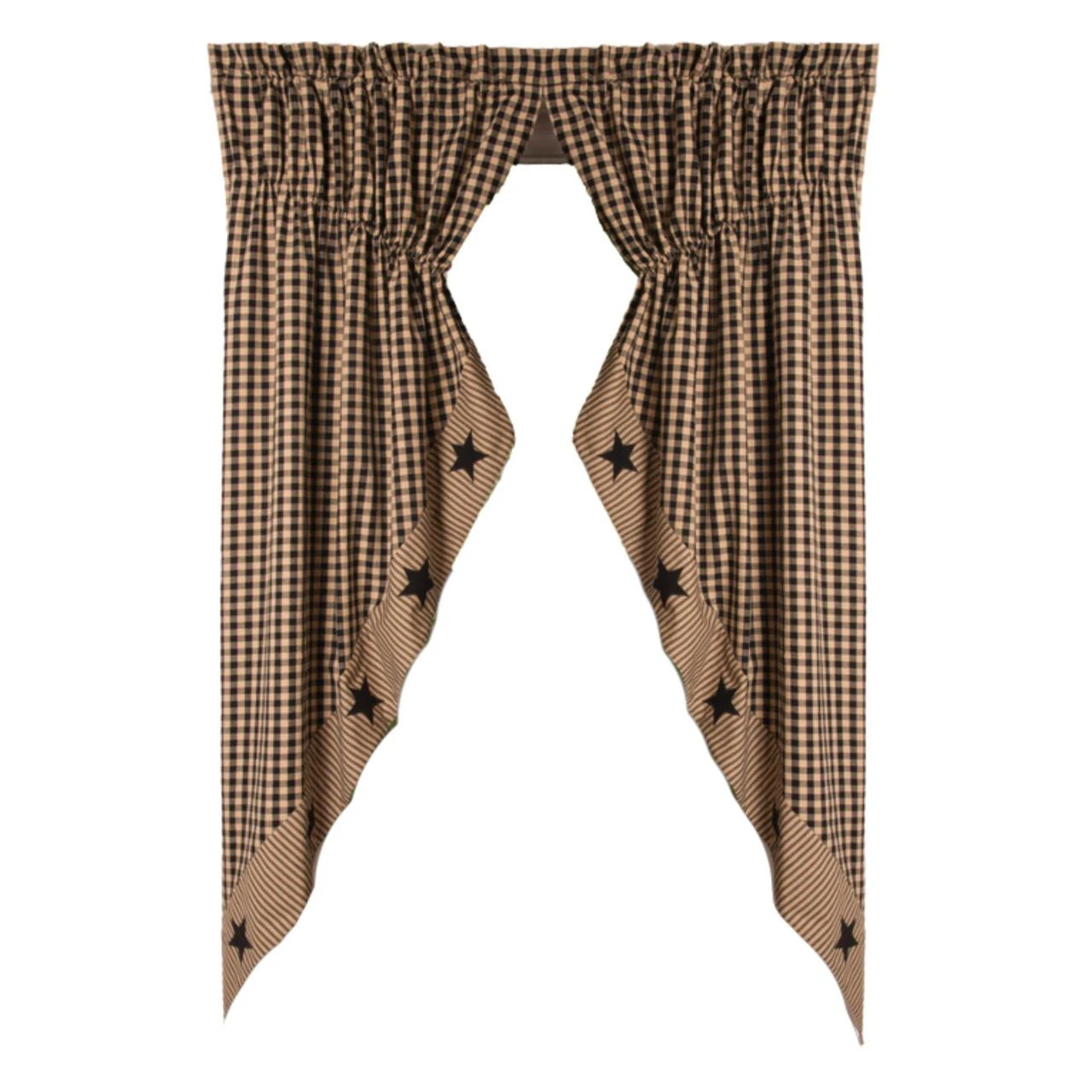 Beautify your windows in the ultimate country style! The Heritage House Check Black Star Prairie Gathered Curtains feature a vintage color palette of black & khaki tan with appliqued black stars dancing along the coordinating striped scalloped hems. Frame your view with this pretty design to make a striking statement in your country home decor!