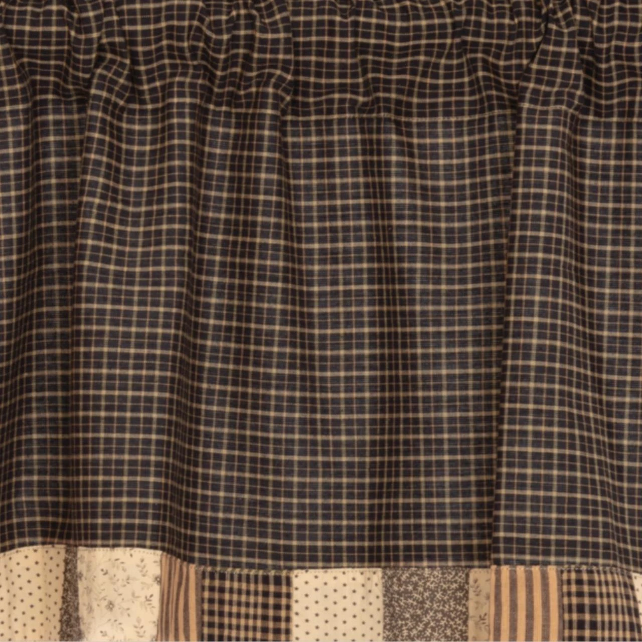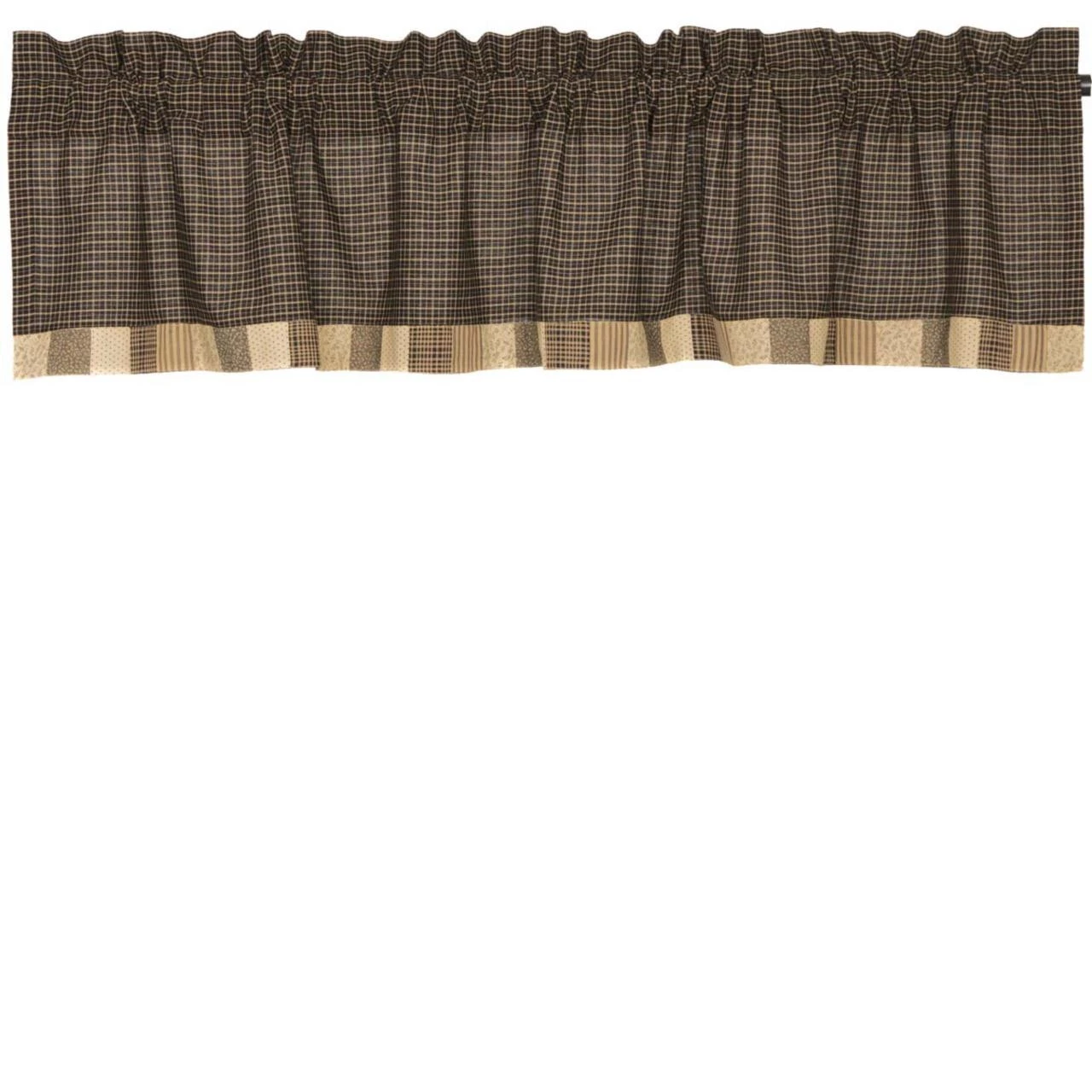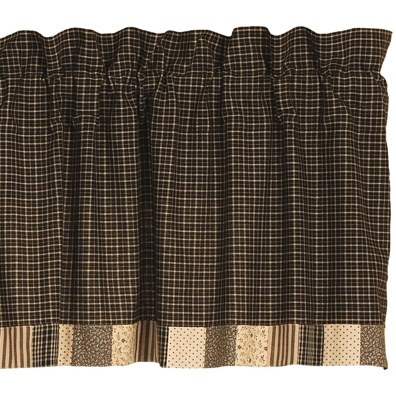 The Kettle Grove Border Valance combines a classic black-and-tan plaid with a hand-pieced patchwork block border featuring an assortment of cream, tan, black, & tea-stained fabrics. This top seller offers a highly-desired primitive appeal that is simplistic yet beautiful!