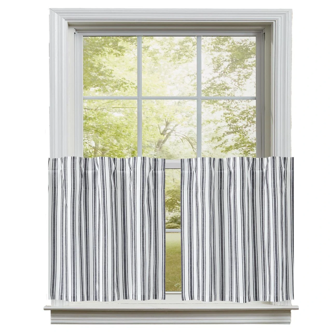 The Sawyer Mill Black Ticking Stripe Tiers by VHC will add that classic country look to your home with its charming black and candlelight white striped design. Add in a matching valance (sold separately) for a great way to add a fresh new look!