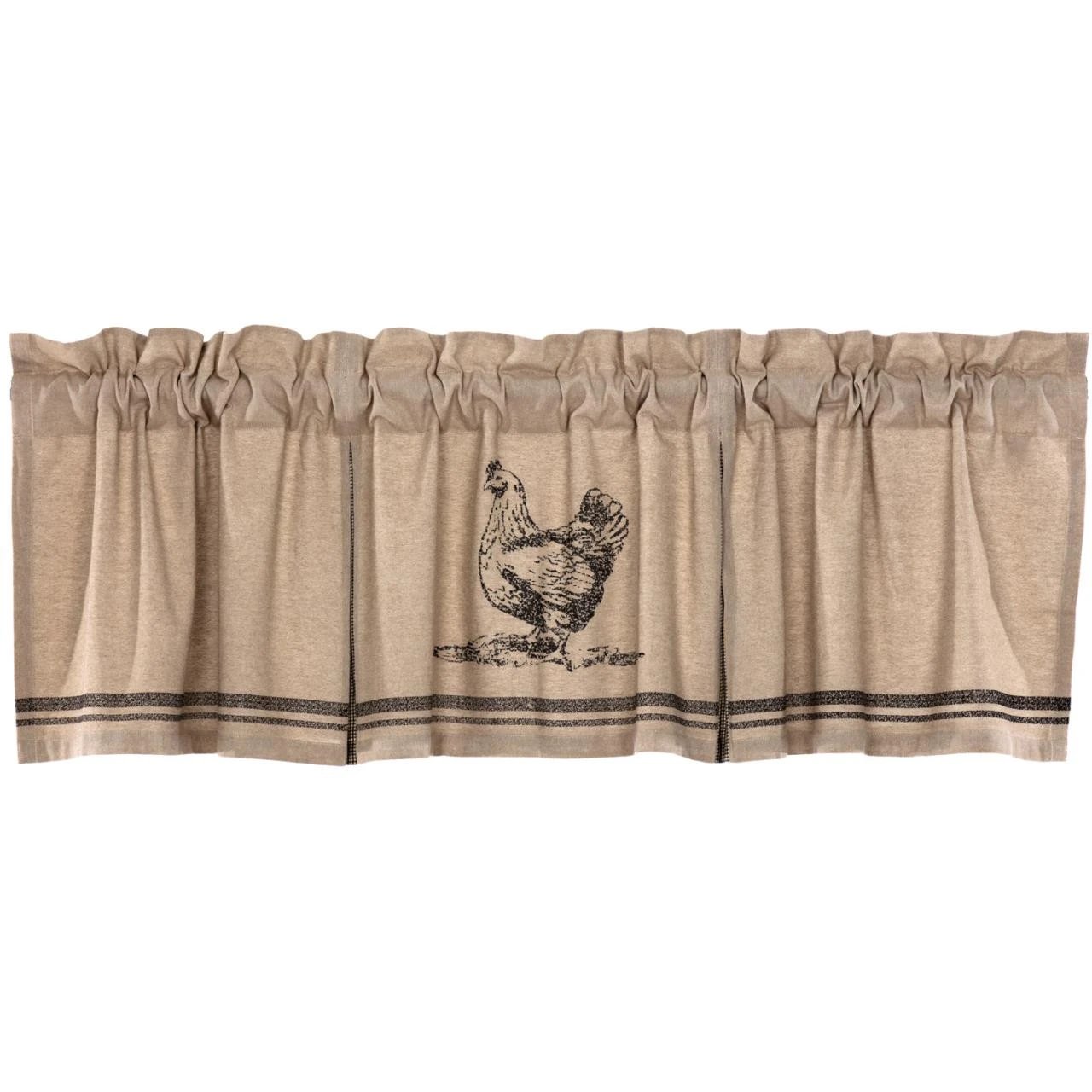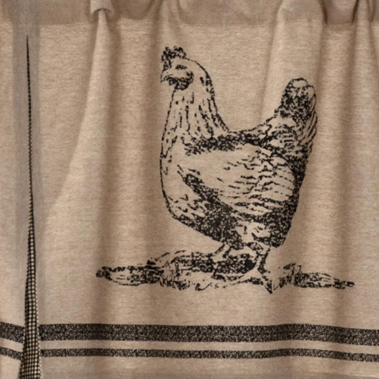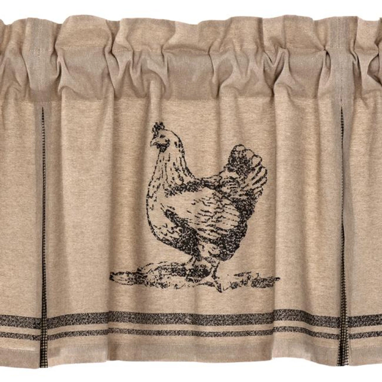 Add some country farmhouse style to your windows with the Sawyer Mill Charcoal Chicken Pleated Valance by VHC! The charming chicken design in charcoal black stands out beautifully on the warm sand brown background! The stripes on the bottom edge and inverted pleats with microcheck detail are the perfect finishing touches!