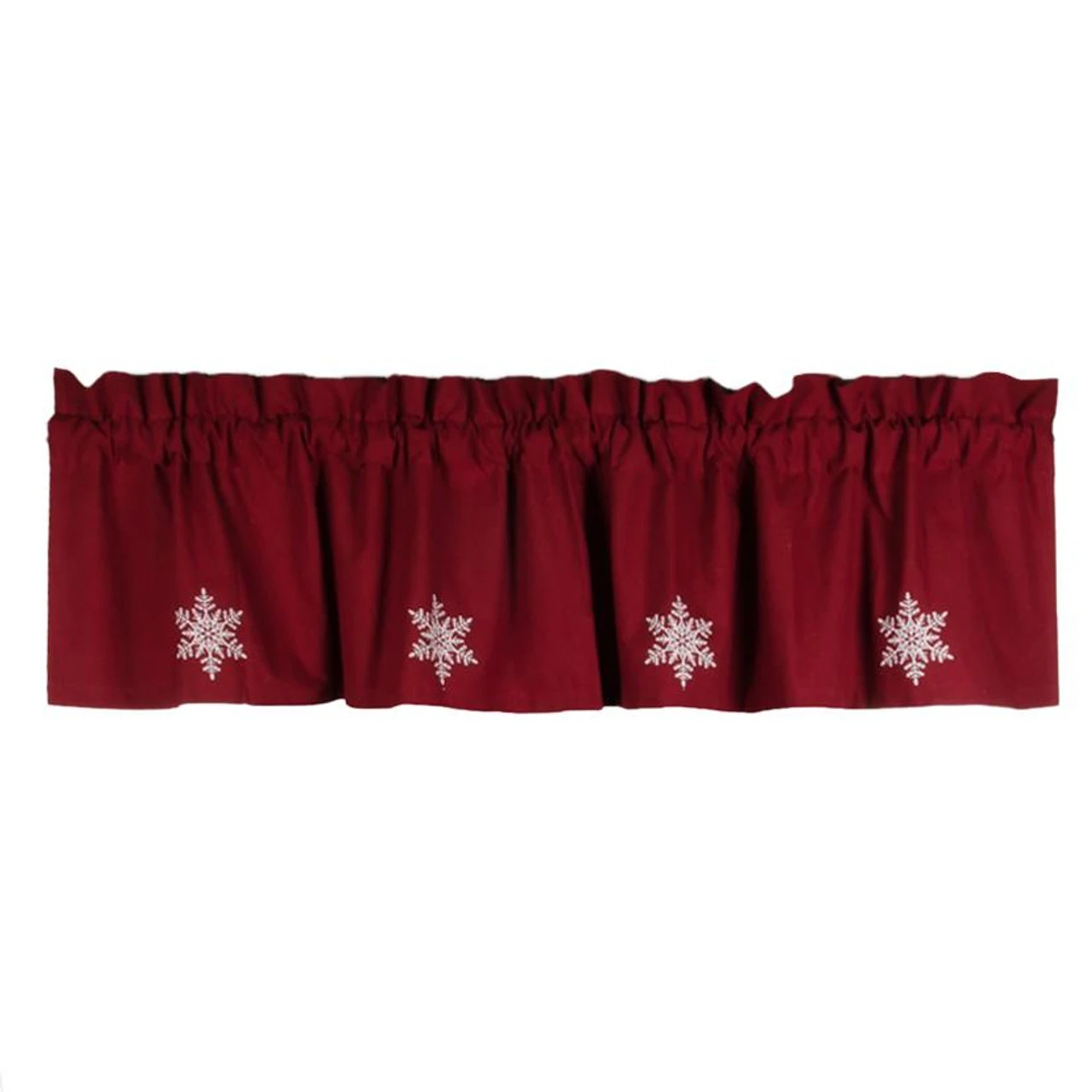 This cheery 100% cotton valance features four white embroidered snowflakes on a rich solid red background.