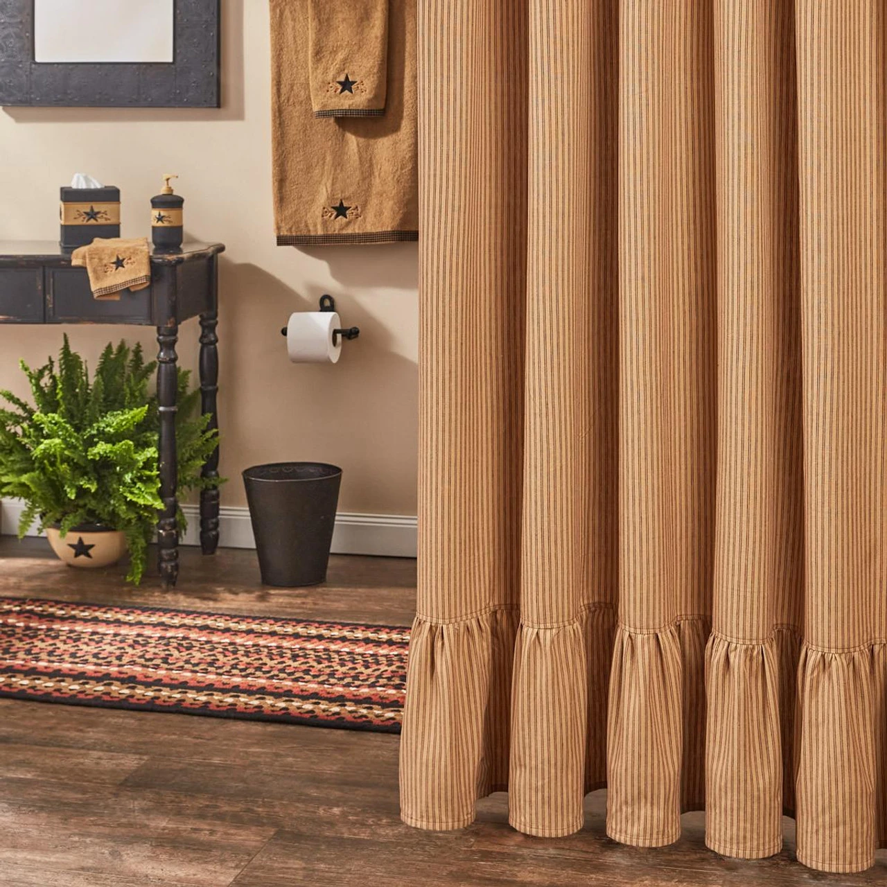 Add a gorgeous country accent to your bathroom with the Sturbridge Ticking Wine Ruffle Shower Curtain by Park Designs! The beautiful ticking stripe pattern in wine and farmhouse tan gives classic style! The ruffles are the perfect finishing touch!