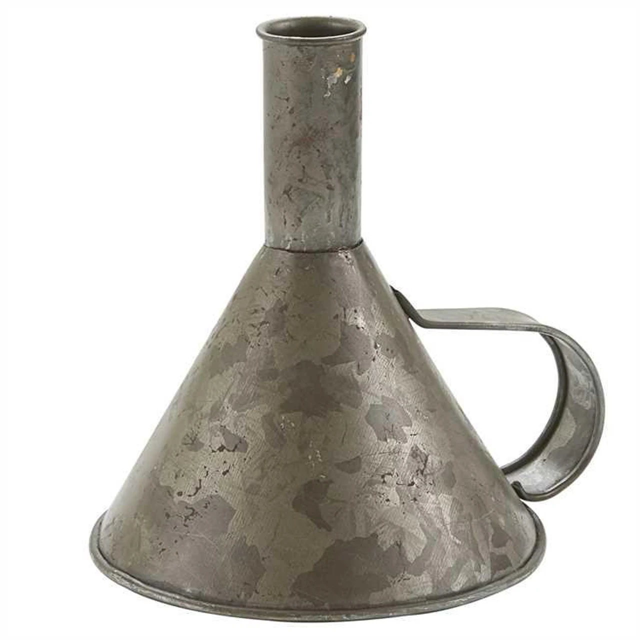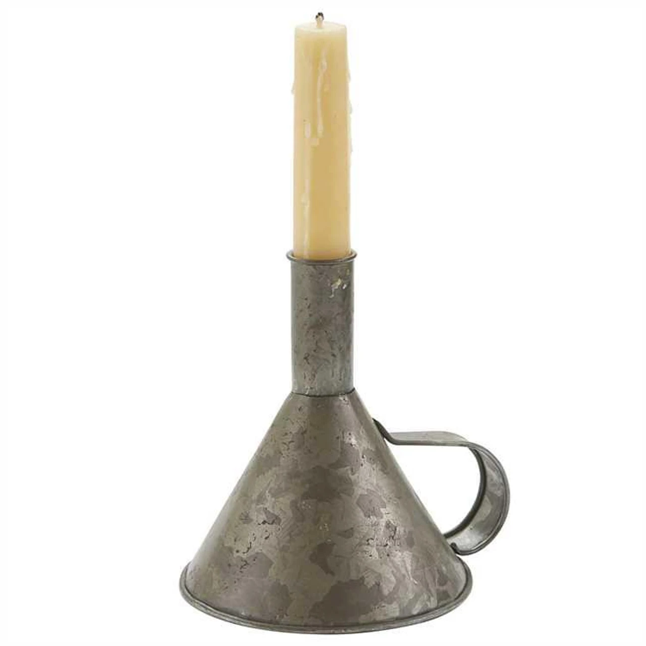 An authentic looking taper funnel candlestick holder in galvanized tin metal is perfect for a country primitive style. Pair it with our other funnel candlestick holders in wine, cast and crimped styles.