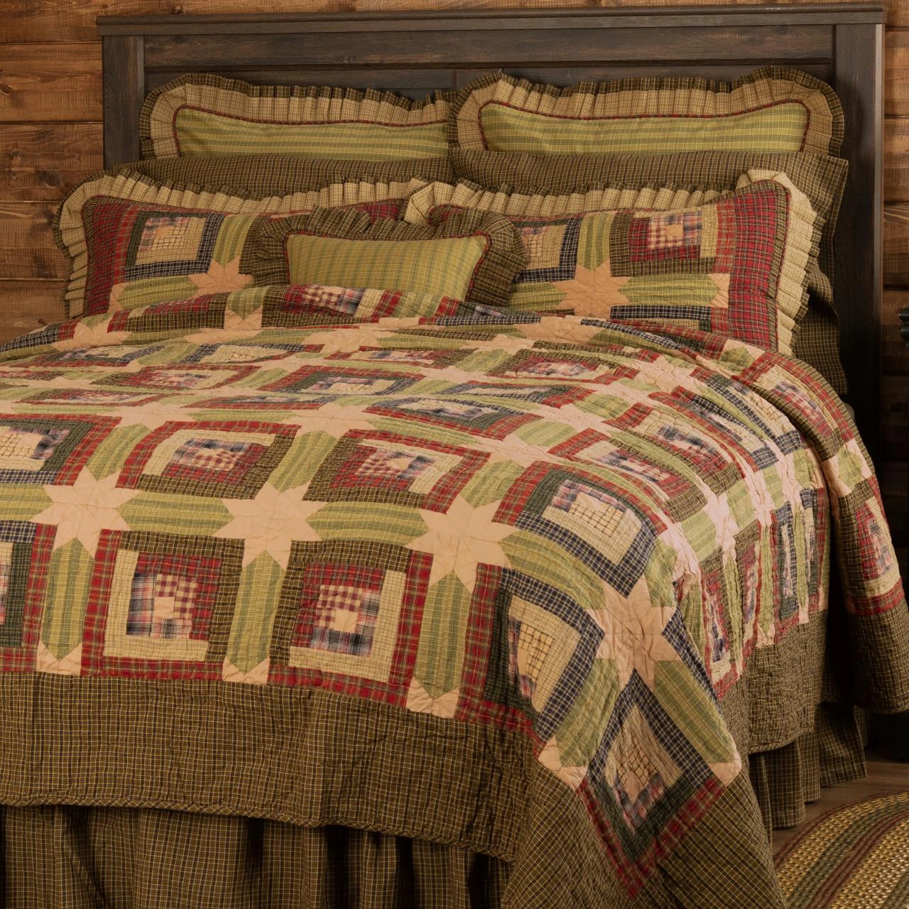 Goodness gracious! The Tea Cabin Quilt combines a stunning array of colors & plaids in the log cabin and Ohio star patterns. Featuring blocks separated by plaid sashing & solid color 8-point stars, this intricate yet restful palette of greens, red, tans & black perfectly complements any country decor. Whether your style is rustic lodge, primitive or traditional country, this stunning quilt oozes countrified elegance!!