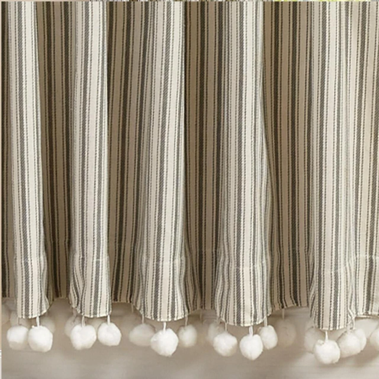 The Ticking With Ball Fringe Swags by Park Designs will add that classic country look to your home with its charming dove gray and candlelight white striped design! The ball fringe is the perfect finishing touch!