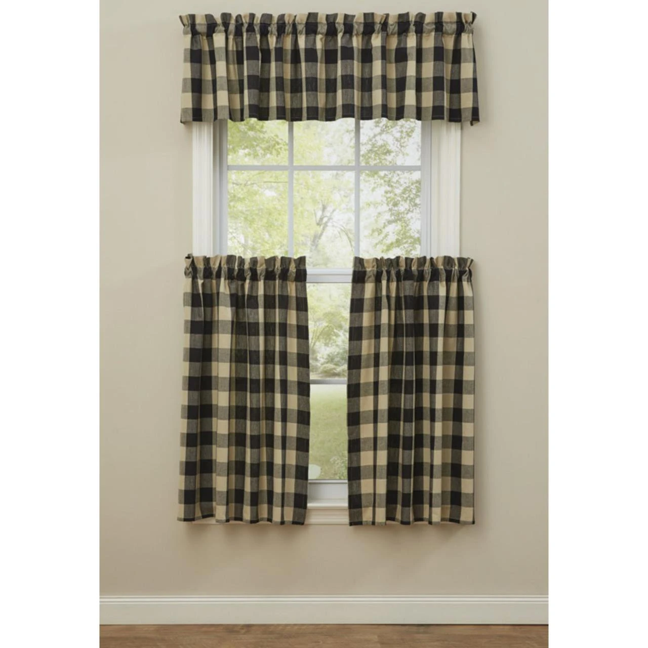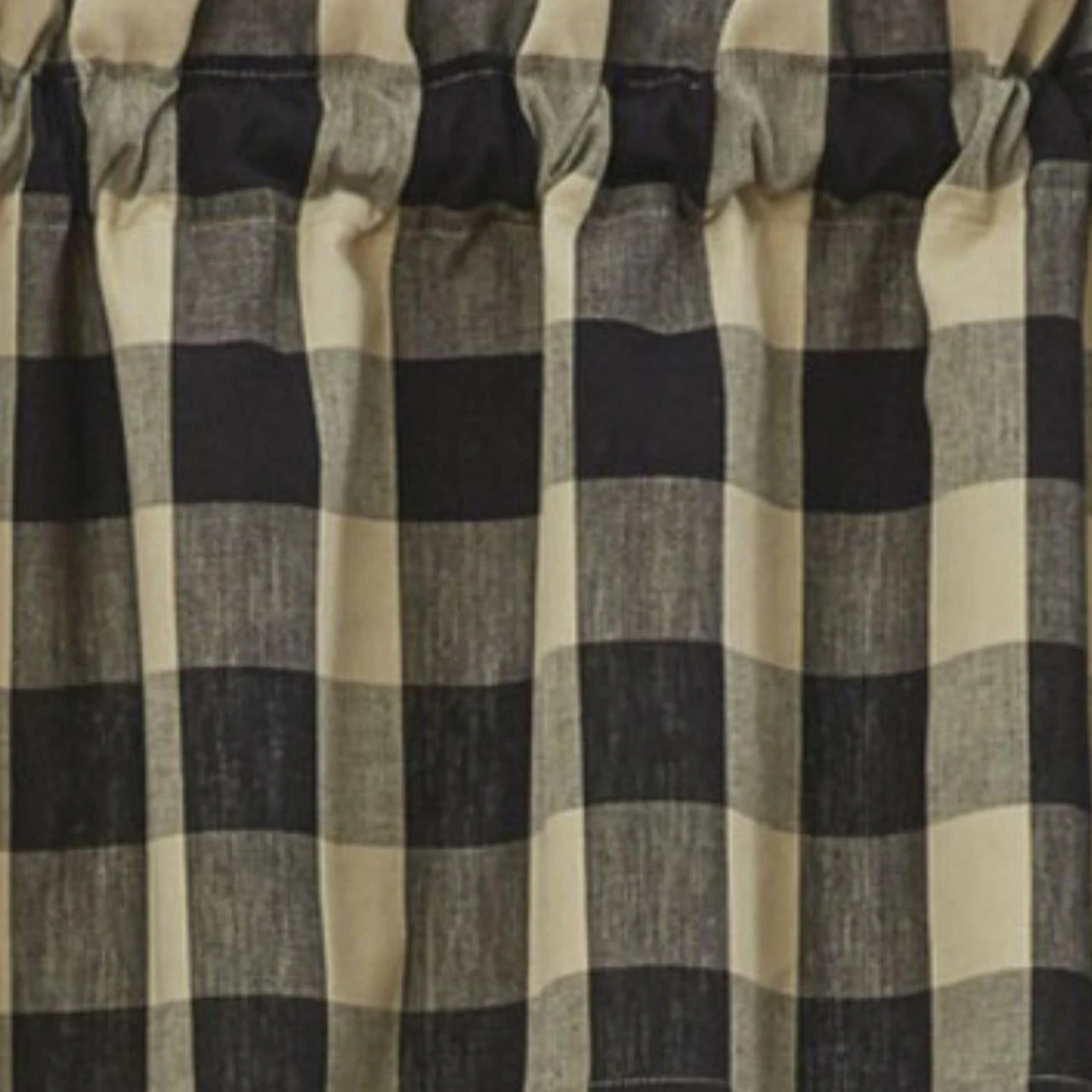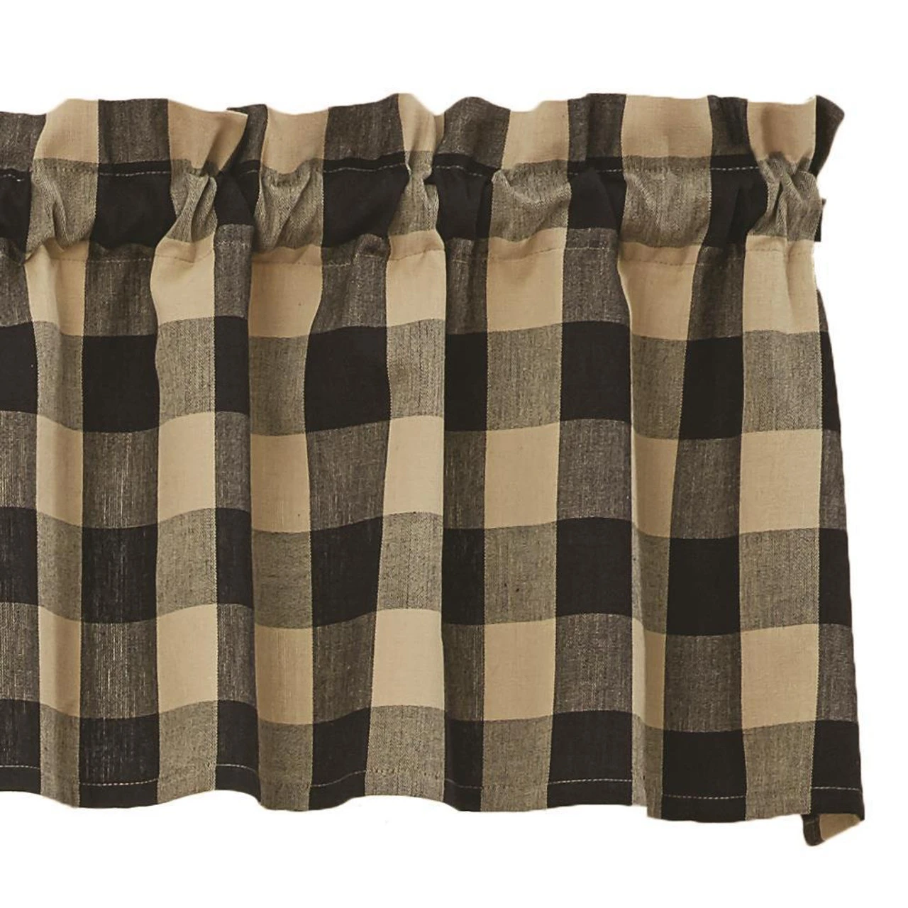 This lovely Wicklow Check Black Valance provides the perfect window treatment for any country home! Sporting a warm tan & black traditional check pattern, this unassuming design is both pretty and practical! It comes unlined to allow soft light to filter through! Perfect on its own, or pair with coordinating tiers for a more dramatic appeal!